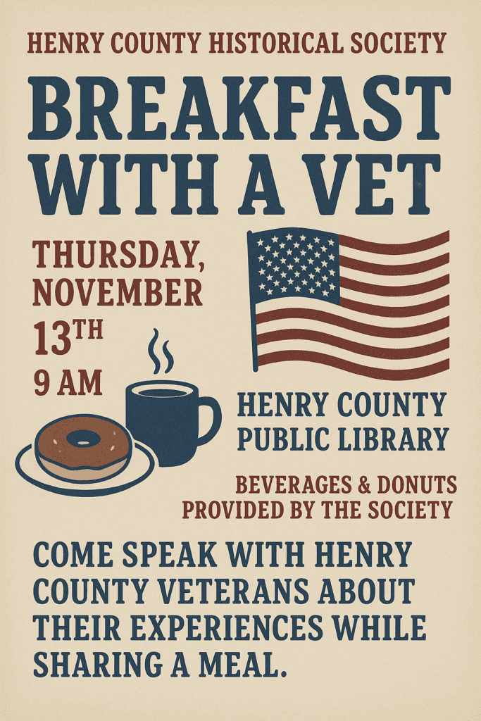 Breakfast With A Vet – The Henry County Historical Society invites you to a special morning of conversation, coffee, and community.
